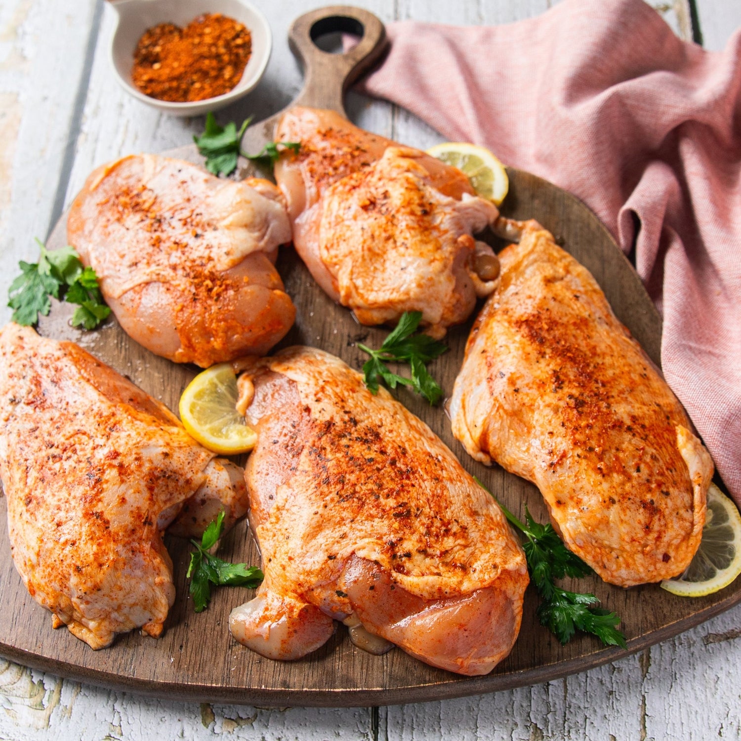 (Item #37) 9-11 boneless Seasoned Skin On BBQ Chicken Breasts (23 x 3.5oz servings), individually vacuum-sealed.